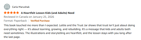 In Lottie and the Trust Jar, children see a character who feels things deeply, makes mistakes, and learns how to repair with support instead of shame. The story shows what calm boundaries, patience, and honesty can look like at home and in everyday life.